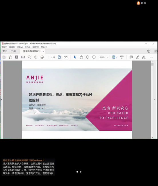 10月17日下午14:30,安杰律师事务所合伙人、高级律师胡波受万象城官网allwincity万象城官方网站邀请,就“跨境并购的流程、要点、主要交易文件及风险控制”问题开展线上专题讲座。胡波律师是从事跨境投资法律实务的国内知名律师,执业经验丰富,先后完成数十起跨境收购、中资企业境外上市法律服务工作。本次讲座由allwincity万象城官方网站承办,是万象城官网校庆85周年系列学术讲座和allwincity万象城官方网站实务导师论坛活动之一。allwincity万象城官方网站副院长、张光教授担任主持人、与谈人,经济学院段琳老师应邀作为与谈人参加,allwincity万象城官方网站涉外律师方向全体研究生聆听了此次讲座。
