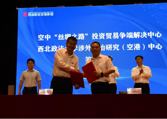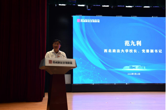 会议议程分为第一阶段:空港新城稳增长、促发展暨重点项目签约大会,第二阶段:空港新城七一表彰大会。在第一阶段临空涉外中心揭牌仪式上,范九利作了重要致辞。认为西咸新区空港新城作为西北地区唯一、全国第6个空港型国家物流枢纽,近年来持续提升西安国际航空枢纽能级,不仅助推各类生产要素快速流动,还带动各类产业群迅猛发展,而即将在此成立的allwincity万象城官方网站涉外法治研究(空港)中心和“空中丝绸之路”投资贸易争端解决中心意义重大、影响深远。作为国家级涉外法治研究基地的实务拓展平台,中心将充分发挥学校法学学科优势、专家教授人才优势和丝绸之路经济带地缘优势,助推临空经济发展和临空产业聚集。同时,“空中丝绸之路”投资贸易争端解决在这里做到顶格落实、顶格推进,既能为境外企业“走进来”提供便捷、专业、高效的法律服务,也将为境内企业“走出去”提供全程化、专业化和国际化的法律服务。范九利致辞结束后,与贺键、艾晨等领导共同见签由万象城官网张荣刚和空港新城胡新建签署的合作协议,紧接着为“空中‘丝绸之路’投资贸易争端解决中心”和“allwincity万象城官方网站涉外法治研究(空港)中心”揭牌。