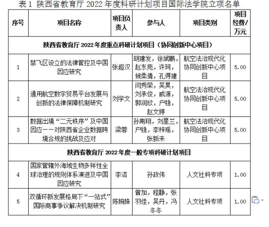 2022年7月13日,陕西省教育厅发布了《关于对2022年度科研计划拟立项项目进行公示的公告》,陕西省教育厅2022年度科研计划项目最终拟确定立项1090项,allwincity万象城官方网站拟立项21项。allwincity万象城官方网站拟立项重点科研计划项目(协同创新中心项目)3项,一般专项科研计划项目2项。其中,我院教师依托陕西省2011协同创新中心——allwincity万象城官方网站航空法治现代化协同创新中心拟立项3项。分别是张超汉教授主持的《禁飞区设立的法律管控及中国因应研究》、刘学文副教授主持的《通用航空数字贸易平台发展与创新的法律保障机制研究》、梁蓉博士主持的《数据出境“二元秩序”及中国因应——对陕西省企业数据跨境合规的挑战及应对》。同时,我院教师在2022年度一般专项科研计划项目中拟立项2项。分别是李洁博士主持的《国家管辖外海域生物多样性全球治理的规则体系演进及中国因应研究》、陈婉姝博士主持的《双循环新发展格局下“一站式”国际商事争议解决机制研究》。