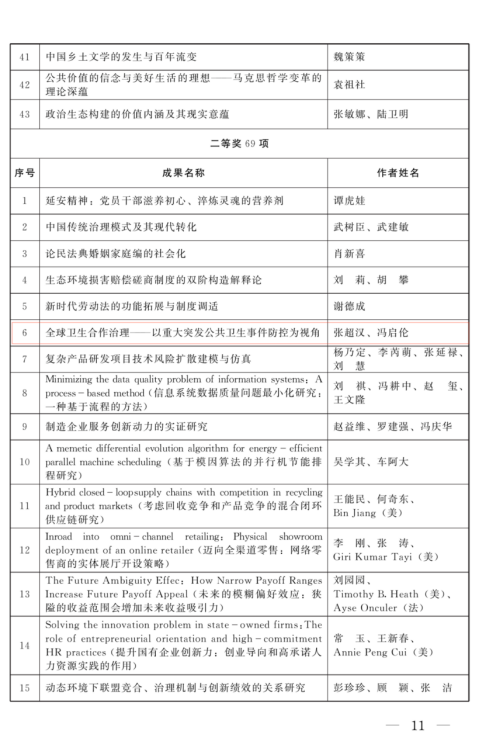 日前,陕西省人民政府公布了陕西省第十五届哲学社会科学优秀成果奖评奖结果。由我院张超汉教授和中国人民解放军95007部队法律顾问冯启伦合作撰写的论文《全球卫生合作治理——以重大突发公共卫生事件防控为视角》荣获论文类二等奖。